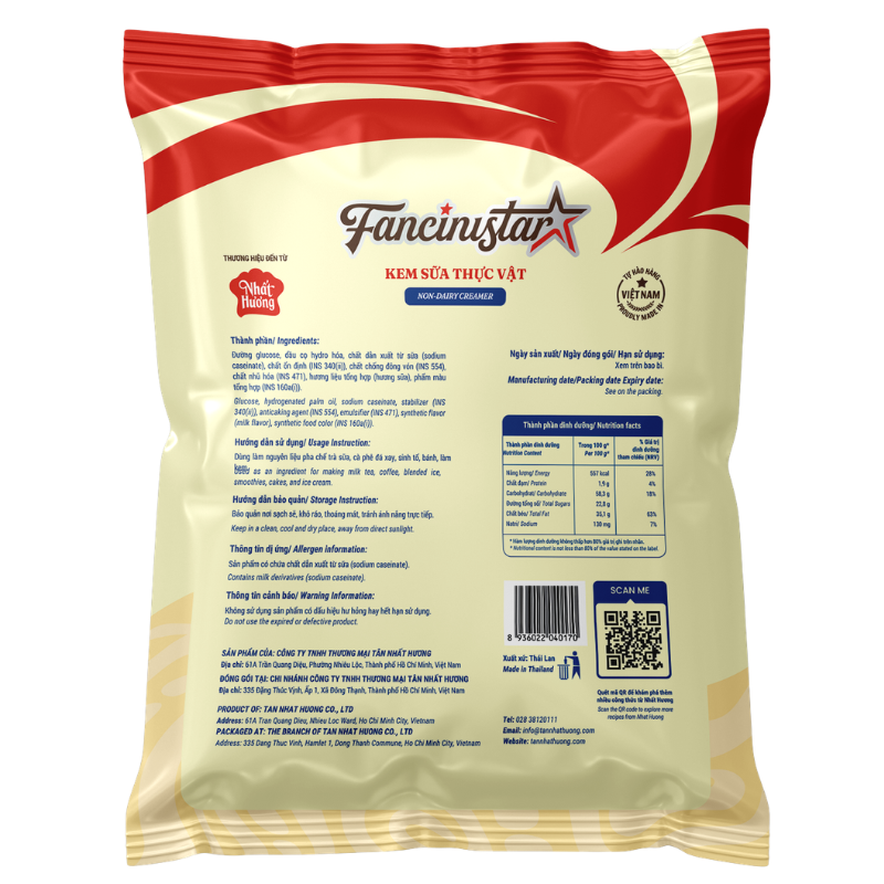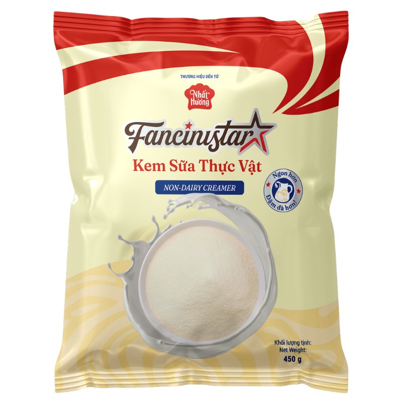 Kem Sữa Thực Vật Fancinistar là một sản phẩm của công ty TNHH TM Tân Nhất Hương. Đây là sản phẩm có kết cấu ở dạng bột, độ mịn cao, dễ hòa tan trong nước. Nên thường được dùng thay thế sữa hoặc kem trong các công thức pha chế thức uống, làm kem, làm bánh,… Đặc biệt, Kem Sữa Thực Vật Fancinistar có ưu điểm là có thể sử dụng thay thế tất cả hoặc một phần cho sữa tươi, sữa động vật trong các công thức pha chế mang đến độ béo thơm tự nhiên hài hòa cho món đồ uống, nhất là món trà sữa thơm ngon và món kem mát lạnh.