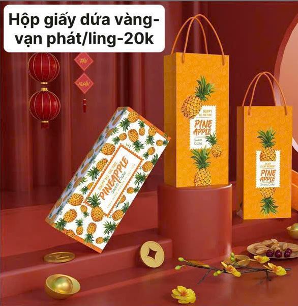 Hộp Dứa Vạn Phát Màu Vàng dùng để đựng bánh dứa dễ thương, hộp được làm bằng chất liệu giấy cứng cáp, hộp có túi đi kèm lịch sự gọn gàng.