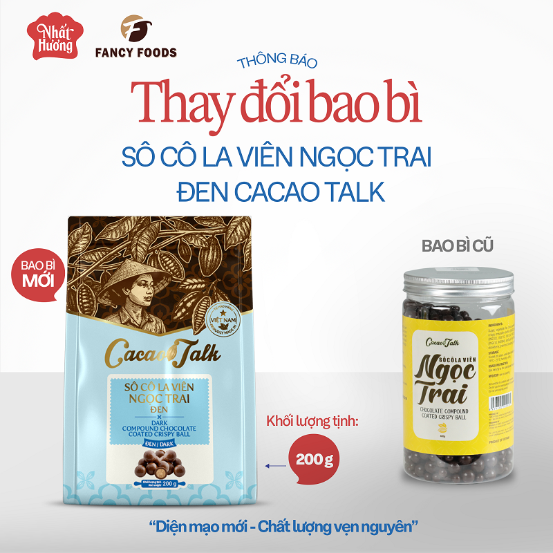 Nhất Hương xin trân trọng thông báo: Thay đổi bao bì Sô Cô La Viên Ngọc Trai Đen Cacao Talk. Theo đó, sản phẩm được chuyển từ quy cách hủ 400 g sang quy cách túi 200 g.